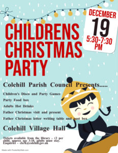 Once again, Colehill Parish Council are hosting a traditional Christmas party in the Village Hall on 19th December between 5:30-7:30pm. Tickets are available from Colehill Community Library from Tuesday 25th November during their opening hours. More details on the poster but suitable for children between 3-10 years old.